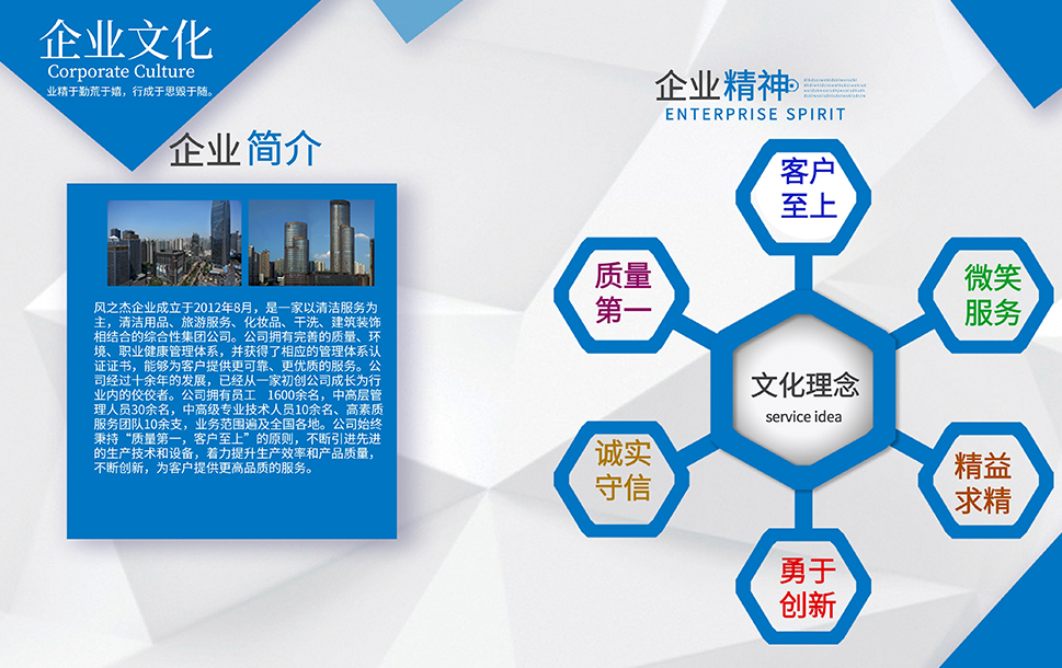 公司于2012年8月成立,致力于將9年的線下管理經(jīng)驗進行線上整合,復制推廣,力爭打造一個全國性的家庭服務平臺,并基于家庭服務的大數(shù)據(jù),融合人工智能,整合服務資源,為家庭提供全方位,多保障的管家式服務,目前風之杰已與全國百余家企業(yè)簽署戰(zhàn)略合作,通過全體員工堅持不懈的努力,逐步布局全國,完善服務,提高品質(zhì),一切努力,只為盡我所能,凈你所想。